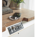 Имеет две электрические розетки и USB-порты для зарядки устройств.