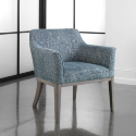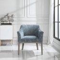 Классическое кресло Kalaria с изящным изогнутым силуэтом обито тканью марлевого типа (chenille) в насыщенных оттенках бирюзово-синего и белого, с декоративной отделкой кантом. Каркас из массива дерева окрашен в серо-грибной цвет с легкой текстурной обработкой «wire brushing», добавляющей стильный акцент. Это кресло станет элегантным и уютным дополнением любой комнаты.