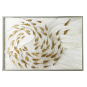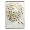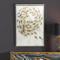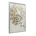 Уникальное интерьерное панно «Shoal» — объёмная настенная композиция, изображающая вихрь золотых рыб. Каждая фигура покрыта золотистым напылением и размещена на фактурном фоне с волнообразным рельефом, что усиливает ощущение движения и игру света. Панно гармонично впишется в современный интерьер, придавая пространству глубину и сдержанную роскошь, становясь выразительным акцентом в гостиной, холле или офисе. Оно привлекает внимание и оживляет стены.