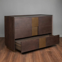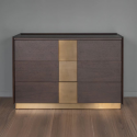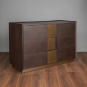 Модель из натурального шпона ореха цвета горького шоколада детально проработана: латунные вставки, скошенные торцы и выразительный цоколь создают уникальный силуэт. Три вместительных ящика с системой плавного закрытия soft-close обеспечивают бесшумность и комфорт в использовании. Этот комод станет ярким акцентом в современной спальне или гостиной.