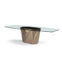 Столешница стола выполнена из прозрачного стекла, что придает столу воздушности, несмотря на массивное основание. Основание - металл в цвете матовая латунь.