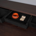 - ОписаниеПисьменный стол Fratelli Barri — элегантное рабочее пространство в современном стиле. Модель из шпонированного ореха цвета горького шоколада с латунной металлоконструкцией сочетает легкость визуального восприятия и продуманную организацию: три бархатных ящика для мелочей и скрытые направляющие основного ящика.