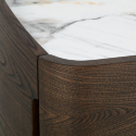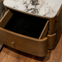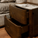 Тумба выполнена из высококачественного МДФ. Отделка - натуральный шпон высокосортного кронированного вяза, тонированного в теплый коричневый цвет. Столешница - керамика в бежевых тонах. Внутри ящиков покрытие меламин. Тумба оснащена двумя выдвижными ящиками, которые обеспечивают удобное и организованное хранение. Ящики cо скрытыми направляющими и системой плавного закрытием soft close. Дно верхнего ящика покрыто бархатной тканью.