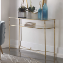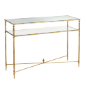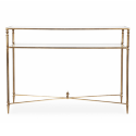 Золотая консоль “Хьюго” — элегантный силуэт из металла с крестообразной перекладиной, отделанной сусальным золотом и состаренной поверхностью. Столешница выполнена из усиленного зеркала, а нижняя полка — из прозрачного закаленного стекла.