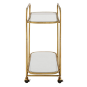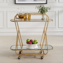 Изысканная сервировочная тележка выполнена полностью из железа с красивой отделкой под антикварную латунь. Две полки в виде подносов с фасетированными зеркалами отражают естественный свет, добавляя интерьеру утончённости и элегантности.